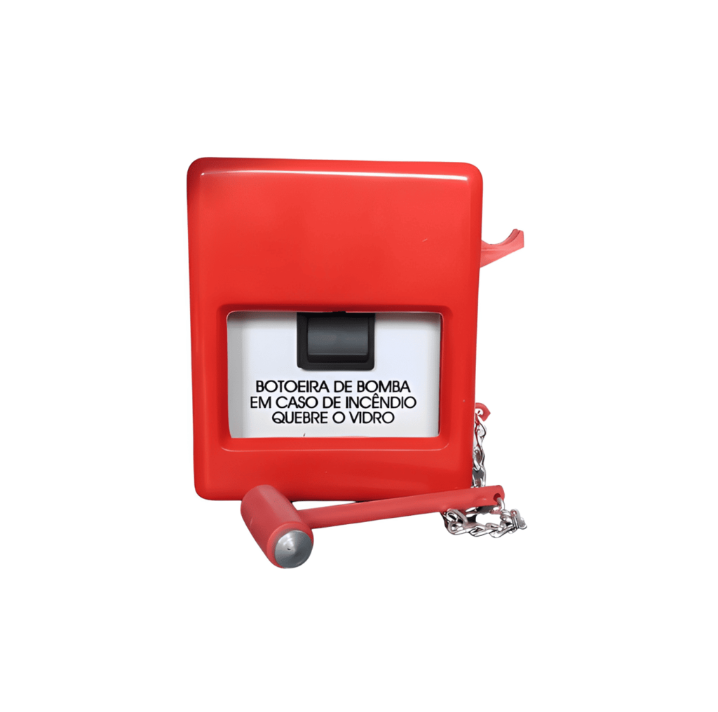 Acionador manual para bomba de incêndio com martelinho e botões liga/desliga (2 fios), fabricado em plástico ABS antichama de alto impacto. Ideal para uso em centrais convencionais de 12V ou 24V.